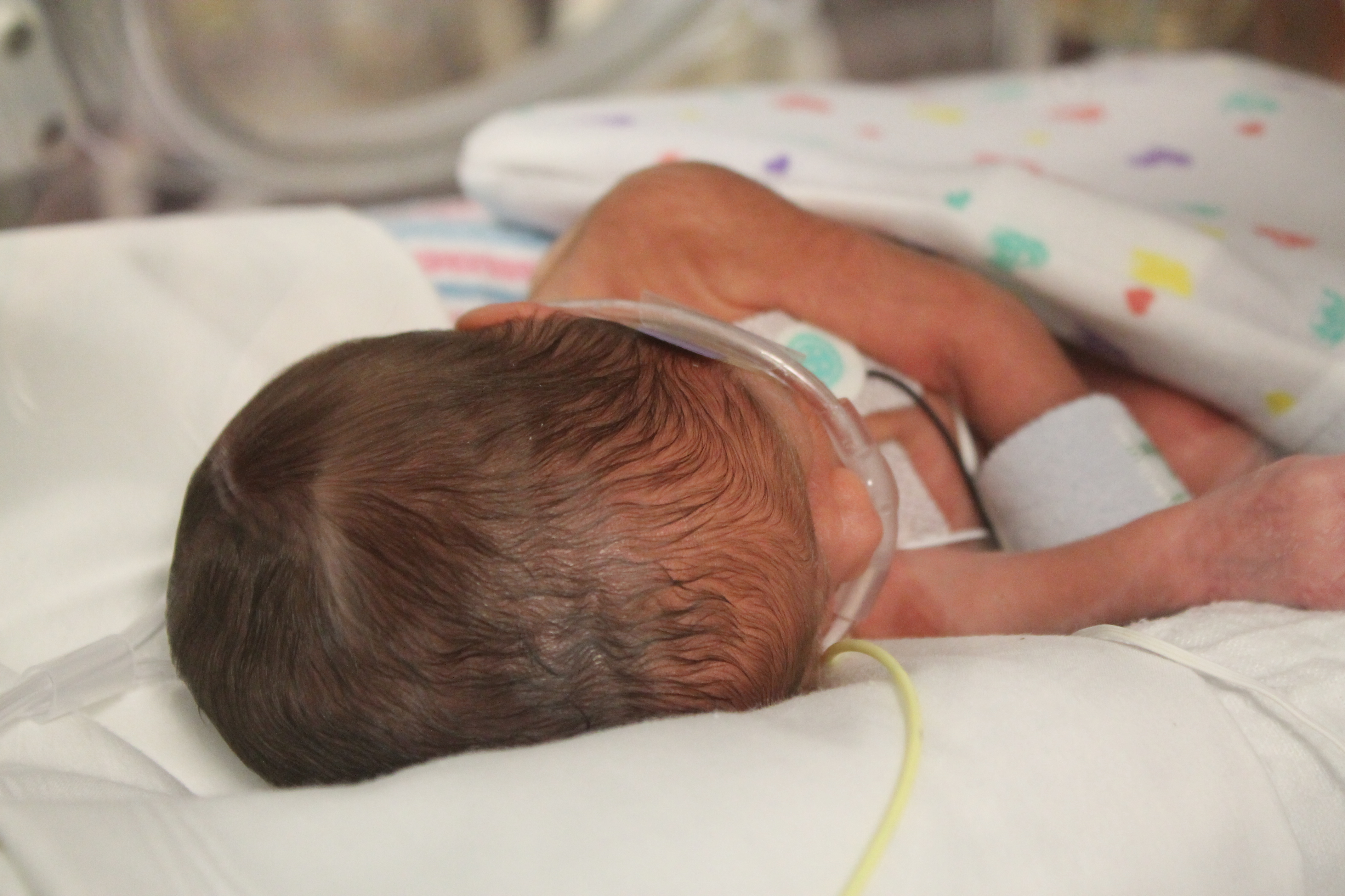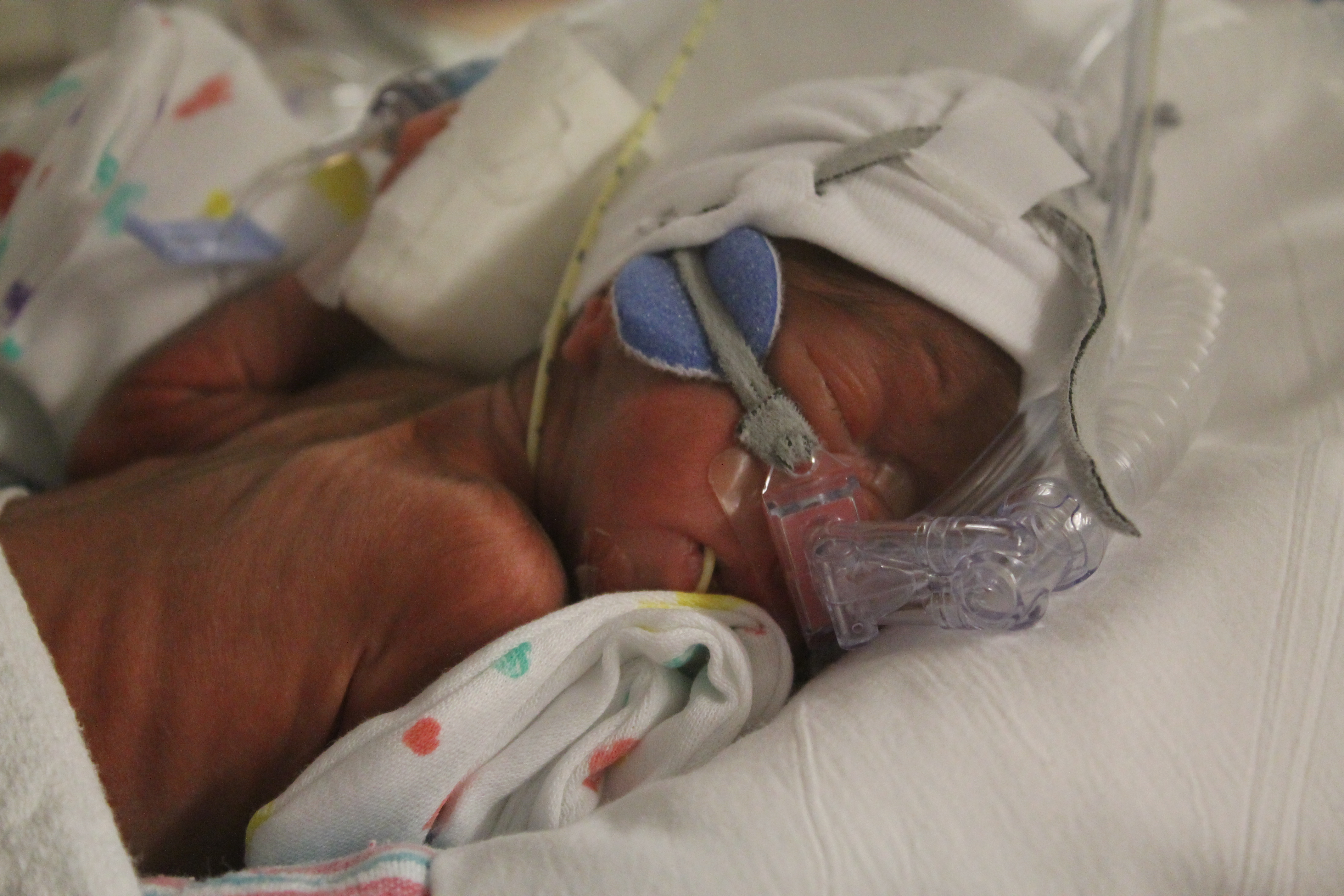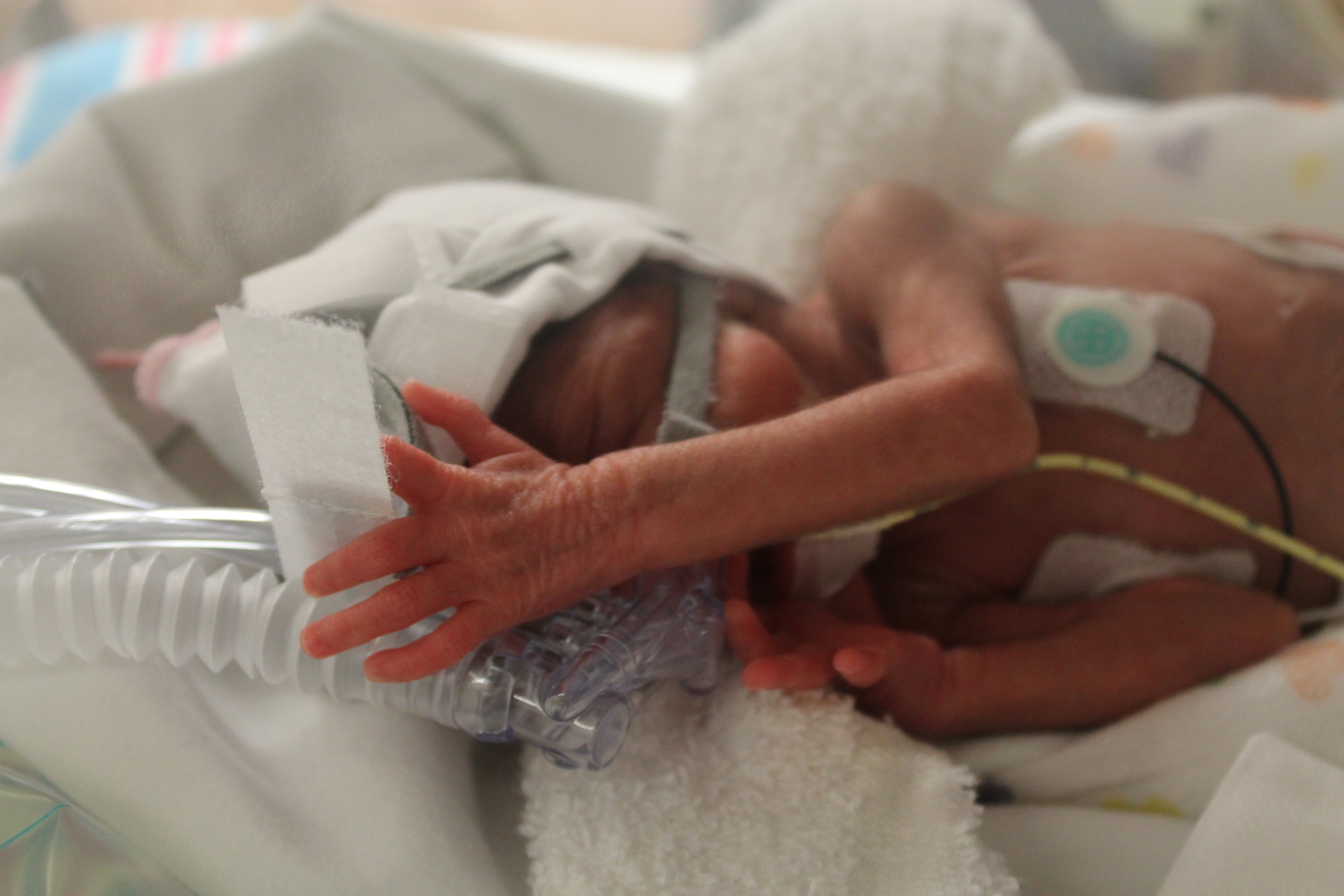 Despite their amazing progress, it’s still a bit difficult for us to get used to the ‘normal’ or ‘typical’ hiccups that premature babies have to work through. Michaela is still receiving continuous positive airway pressure (CPAP). Although she is no longer on a full ventilator and can breathe room air, CPAP ensures that her not fully developed lungs expand properly with each breath. This requires that she wears a (very uncomfortable) mask at all times – ‘typical’ for babies at this stage.